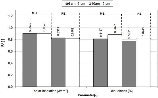 Average values of the determination coefficients for the analyzed external factors, divided into two hourly ranges (6 am–6 pm and 10 am–2 pm) of the input data range for multi-family buildings (MB) and public buildings (PB).