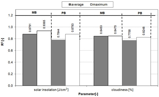 On the basis of the above-mentioned detailed results and their analyses, it was found that it was justified to use, in further considerations, only the data from 10 am to 2 pm for the average and maximum wind speed below 3 m/s, which guarantees the best possible consideration of the influence of both solar insolation and cloudiness on the amount of heat power used for heating. This approach to the issue minimizes the influence of both wind speed and system users as disturbing factors, which usually occur in parallel with solar insolation/cloudiness and may result in incorrect consideration of the influence of the analyzed external factors on the demand and prediction of heat power for heating the buildings.