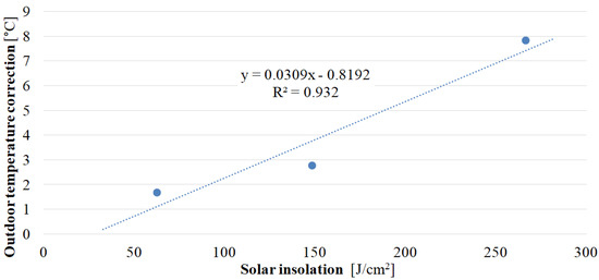 Additionally, when determining the outdoor temperature correction due to the influence of solar radiation, it was found that the obtained results for solar insolation were more accurate (R2 = 0.8850) than for cloudiness (R2 = 0.8472). Therefore, it was recommended to use solar insolation as a parameter as it was more reliable than cloudiness in the calculations of a building energy model.