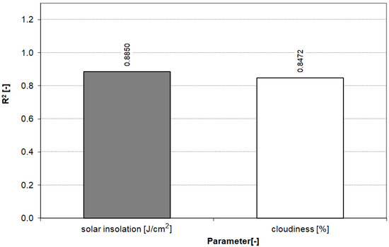 On the basis of the conducted research, it was found that it was justified to narrow down the scope of data included in the calculations (narrowing down to 10 am–2 pm, at wind speeds below 3 m/s) in order to minimize the disturbances caused particularly by wind and building users. This was due to the fact that for such a narrowed range of data, the correlation equations for solar insolation or cloudiness from the outdoor temperature were obtained, which were characterized by high average values of determination coefficients at the level of 0.9043 (for solar insolation) and 0.8827 (for cloudiness in %) for the analyzed residential buildings.