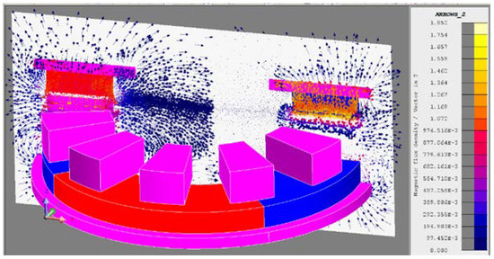 The seemingly simple issue of the static analysis of the magnetic field in MGs often involves two-dimensional numerical analysis only. A detailed analysis of end-effects (leakage, fringing, and escaping) presented in the papers [10,24] clearly points to the need to be rather careful when designing RFMGs, which are theoretically simpler to describe. In the majority of cases, the nature of the magnetic field characteristic of axial flux machines and the requirements for calculation accuracy necessitate the use of three-dimensional numerical models. The vector distribution of the magnetic field for the selected cross-sectional plane of the MG2 model shown in Figure 2 illustrates its complexity and potential sensitivity to fringing. The plane is oriented such that it passes through the center of the core (pole piece) and into the opposite side of the air area. The visible high densities of vectors in the MG central and external areas suggest possible fringing areas. However, the detailed analysis of this magnetic field distribution, which also considers the modulus of individual vectors, suggests that magnetic field fringing is relatively low. Still, it seems advisable to use a material with low magnetic permeability for the shaft and external covers. It is also difficult to provide a definite answer in terms of the advantage of an axial flux gear over a radial flux one.