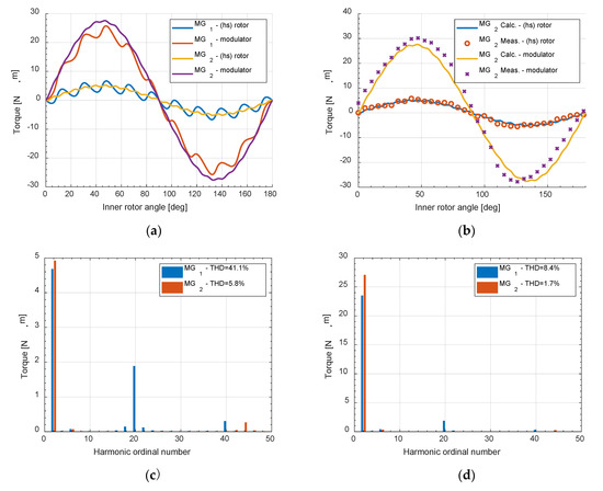 Despite their very similar designs, the AFMG models considered in the paper differ in one relevant aspect, which is the gear ratio. In spite of a relatively small difference in the mentioned gear ratio, significant changes in the torque characteristics (Figure 3a) are observed, which are also mentioned by other authors [12,24]. An over fourfold increase in magnetic torque pulsation for MG1 significantly affects the ergonomics of the gear, which is magnetically balanced in theory. The lines visible on the FFT spectral torque characteristics (Figure 3c,d) and the determined total harmonic distortion (THD) values point to a clear advantage of the structure with a fractional gear ratio. Even though the paper focuses on two AFMG configurations, the authors decided to verify only one of them through measurements. Detailed measurements of static characteristics were performed for the MG2 gear with a fractional gear ratio. Figure 3b presents the obtained results of torques associated with the high-speed rotor and the modulator. In our opinion, the discrepancies visible in the presented characteristics are acceptable and allow for a further simulation-based discussion.