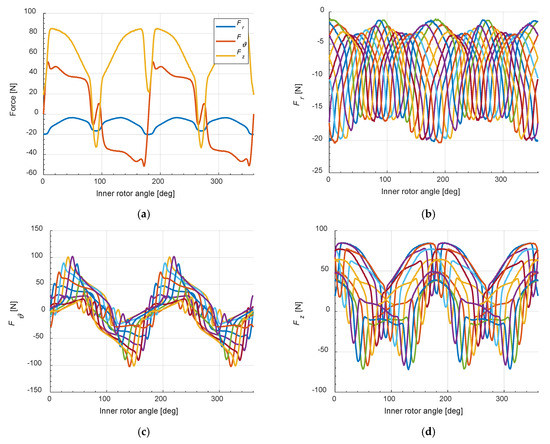 Component fluctuates the least, while maintaining its applicability to the system rotation axis. However, the specific nature of the gear operating state, i.e., with the modulator locked, means that each core is affected by different interactions due to the angular position of the perimeter. With this in mind, Figure 5b–d shows the angular variability of these components, including all cores from P1 to P11. Based on the analysis of the envelopes of the obtained characteristics, it can be seen that the radial forces are by far the smallest and always face the gear rotation axis. Considering the tangent and axial components, differences between individual cores in terms of both value and nature can be easily noticed.