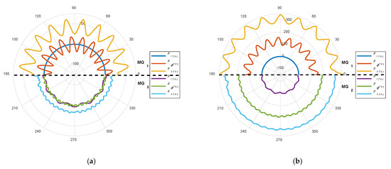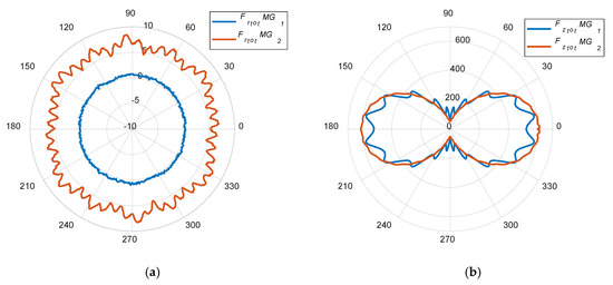 The analysis of magnetic forces in radial and axial directions is also interesting. Treating the modulator as a rigid element, the geometric summation of local force components was performed. Equations (1) and (2) describe the resultant radial and axial force, respectively. The calculations also involved checking the torque value using Equation (3). Figure 6 shows the resultant forces depending on the angle of rotation of the high-speed rotor . The magnetic unbalance caused by a fractional gear ratio for the MG2 variant (Figure 6a) is marginal compared to the axial force seen in both MG designs (Figure 6b):