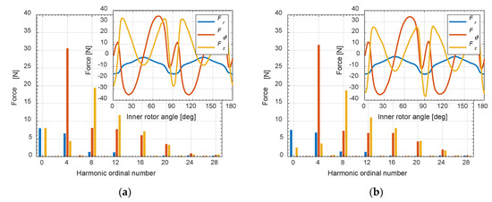 Force components acting on a selected SMC modulator core and their FFT spectra at no load for two gear variants: (a) MG1 (b) MG2.