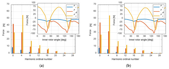 In the idle state (Figure 7a,b), for both MG variants, the tangent component Fϑ is subject to the highest fluctuations, while the clearly dominant 4th harmonic is associated with the number of high-speed rotor pole pairs. For loaded gears (Figure 8a,b), the appearance of a constant component in the tangential force component spectrum responsible for torque transfer can be seen, which was to be expected. Small discrepancies in the spectrum of component Fz in the idle state are mainly due to the differences in the number and angular span of the modulator cores and low-speed rotor magnets in both gear variants. Under maximum load, the value of the constant component and the 4th harmonic increases considerably, which is the system’s response to the extension of the core away from the neutral axis caused by the load. Although local, because it is limited to a single core, the analysis presented in this paper provides some relevant information that is useful for possible vibroacoustic, strength and ageing tests, especially in terms of prototyping using additive manufacturing methods. However, the synthesis of local effects is also an interesting issue, as it allows the properties of the MG variants under consideration to be assessed as a whole.