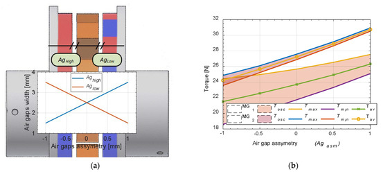 (a) The variants of the air gap asymmetry. (b) Calculated torque characteristics (Tmin, Tav, Tmax) for AFMGs (MG1 and MG2) vs. air gap asymmetry (Agasm).