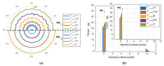 Of course, the most important operating state is the synchronous operation. The spectral characteristics of the local force components associated with each of the modulator pole pieces are very similar. Thus, the key issue is not only the quantification of local forces (almost identical for both variants of the MG), but also a global view taking into account all local interactions. These visible differences in the force amplitudes and pulsation levels for particular force components, when translated to the global characteristics of Figure 9, also emphasize the advantage of the MG2 gear variant.