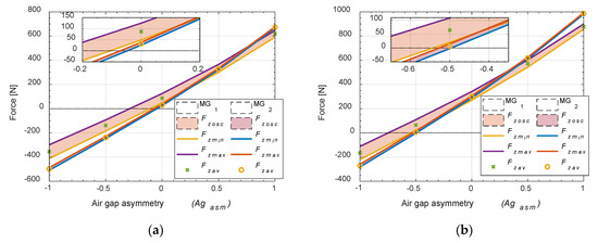 The value of the axial force is strongly dependent on the operating point, as illustrated by the characteristics shown in Figure 12. As shown on the characteristics, both gear variants are relatively well-balanced in the idle state, considering magnetic forces in the Z axis. However, moving to the rated load with the symmetry of the air gaps, as in the prototype, causes the axial load facing the low-speed rotor of approx. 300 N to appear. As is commonly accepted, in the extreme case, when analyzing the asymmetry variant Agasm = +1, the value of the axial force approaches 1 kN facing the low-speed rotor. When using the opposite asymmetry variant Agasm = −1, the axial force facing the high-speed rotor appears. As it is commonly accepted, electromechanical transducers are built for a given operating point. For the analyzed AFMGs operating under full load, the most advantageous air gap width variant in terms of balancing axial loads is Agasm ≈ −0.5. In this configuration, the axial force was almost entirely eliminated; however, the torque was also reduced.