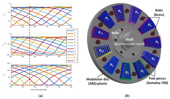 (a) Forces components (, , ,) of MG2 for all modulator cores (P1–P11) used in the mechanical analysis, (b) part of modulator disc with visualization of forces applied to each of SMC cores.