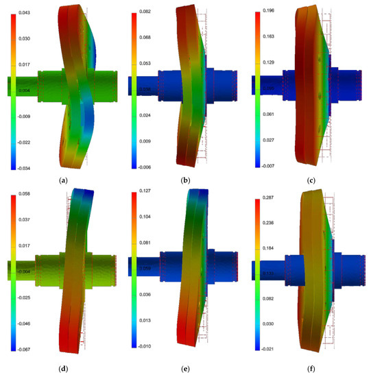 Results of displacements in the Z axis at a max load for Agasm = −0.5, Agasm = 0, and Agasm = +1 respectively, (a–c) MG1, (d–f) MG2.