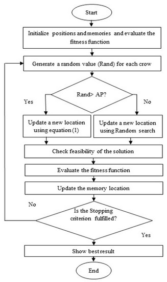 The crow search algorithm is inspired by natural events. In Figure 3, the flow chart diagram of the primary crow search algorithm is shown. Crows have astounding capacities to take care of complex problems. They closely observe other birds and watch very carefully where others try to hide their food. They attempt to take the food when the proprietor vacates their spot. The crow search algorithm is designed based on the following facts.