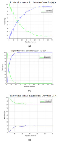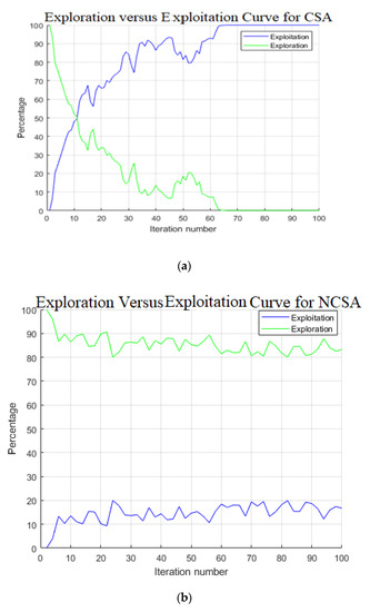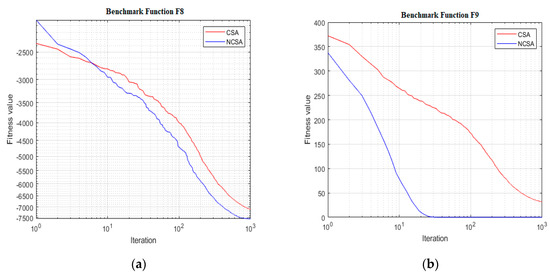 The benchmark functions from f8 to f13 (Appendix A) are suitable for the exploration ability test. These multimodal functions have many local optimums, and finding the global best is very difficult. Since the focus of the study is to tackle multimodal optimization problems, the proposed algorithm should work better in these benchmark functions. According to Table 2, the proposed NCSA was better than CSA. Table 2 and Table 3 demonstrates that the proposed NCSA algorithm outperforms other algorithms in f8, f9, f10, f11, f15, f16, f17, f18, and f19 benchmark functions. In other cases, it offers competitive results. Therefore, the results show that NCSA is superior in terms of exploration capacity.