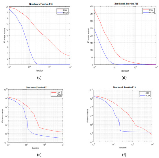 Convergence curve for CSA and NCSA for Multimodal Benchmark function f8–f13 (a–f), (a) f8 benchmark function, (b) f9 benchmark function, (c) f10 benchmark function, (d) f11 benchmark function, (e) f12 benchmark function and (f) f13 benchmark function.