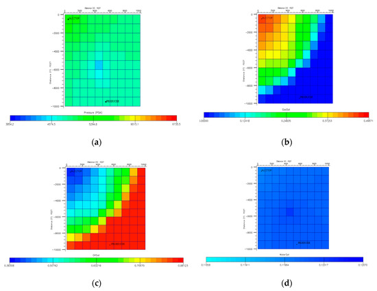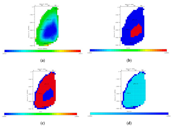 Description for case study 2 (a–d), (a) Initial pressure, (b) Initial gas saturation, (c) Initial oil saturation and (d) Initial water saturation.