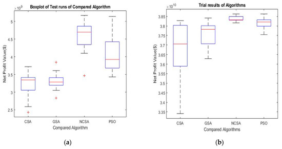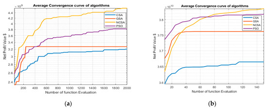 Convergence curves are an important tool for analyzing the convergence speed of an algorithm and comparing its performance with other algorithms. Figure 9 shows a graph of the average NPV and number of iterations for the GSA, PSO, CSA, and NCSA algorithms. Case study 1 used 100 iterations and case study 2 used 30 iterations [54]. In case study 1, the search space is a 19 × 28 × 5 grid blocks. Case study 2 has 10 × 10 × 3 grid blocks. Therefore, for case study 1, the search space is larger than case study 2. Hence, for case study 1, the calculation requires more effort to find an optimized location. Since we are using the PUNQS3 reservoir, the previous study used 100 iterations [75]. Figure 9b shows that the best results, after a particular time, have not changed in case study 2. Basically, the convergence curve showed a horizontal line after a certain point. The horizontal line in Figure 9b shows that the search technique has reached the optimum value and there is no further improvement possible. Therefore, for case study 2, 30 iterations are sufficient.