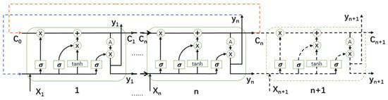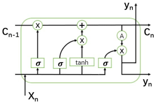 Aiming at the characteristics of photovoltaic output during non-stationary periods, this paper adopts an improved Stack-LSTM model to predict photovoltaic power with certainty points [2,28]. The standard LSTM neural network is improved from the general recurrent neural network (RNN) recurrent neural network model, which solves the problems of long-term dependence and gradient disappearance in the RNN network; compared with other networks, the processing of nonlinear problems has greater advantages. The standard structure is shown in Figure 3.