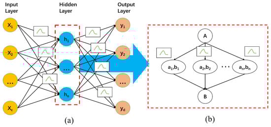 In Figure 5, A and B are the input and output vectors of the hidden layer, respectively; is the weight of the n-th unit, which obeys the distribution of the form , and is the bias of the n-th unit [22].