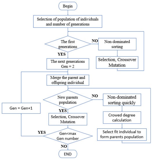 The basic idea of the NSGA-II described as follows: an initial population of size N is generated randomly [25]. Then, after non-dominated sorting, the first-generation progeny population is obtained through three basic operations of the genetic algorithm including selection, crossover, and mutation; subsequently, starting from the second generation, the parent population and the offspring population are merged to perform fast non-dominated sorting [29]. Meanwhile, for forming a new parent population, the crowding degree calculation of the individuals in each non-dominated layer must be implemented according to the non-dominated relationship and the crowding degree of the individuals. Finally, a new progeny population is generated through the basic operation of the genetic algorithm; Follow above reasoning, until the conditions for the end of the program are met, the specific flowchart is shown in Figure 6.