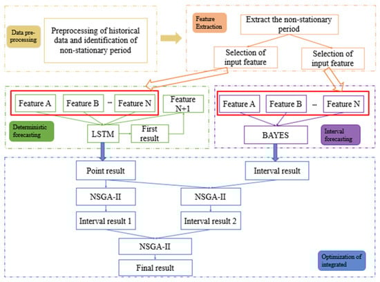 To the best of our knowledge, each model has disadvantages and advantages. Therefore, none of these models can always achieve the desirable prediction results [23,24]. To further improve forecasting performance, this paper proposes a multi-objective optimization-based ensemble probability forecasting (MLBN) model for the non-stationary period of photovoltaic output based on the research of previous authors [25,26]. Modeling is divided into three stages: in the first stage, the historical output data of photovoltaic power plants are preprocessed, feature selection is performed based on the MIC theory, and the most suitable input features are selected; in the second stage, according to the feature selection results of the first stage, the features are respectively input to the improved LSTM algorithm and the BAYES neural network to obtain the initial deterministic point prediction results and the uncertainty interval prediction results; in the third stage, the initial interval prediction value is optimized to meet the narrowest interval width and the highest interval coverage, and then the initial point prediction result is optimized and estimated, and it is expanded to a new interval prediction value. Finally, the NSGA-II optimization algorithm is used to perform multi-objective optimization of the two new interval prediction values to obtain the final prediction interval.