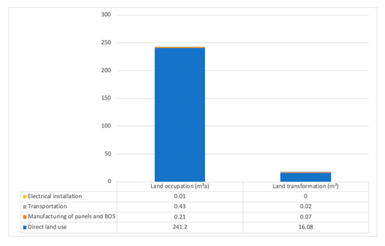 The land occupation of 241.85 m2a represents the area of land occupied by the solar infrastructure to generate one MWh of solar power within 30 years of operation. The land transformation of 16.17 m2 represent the area of land needed to be transformed from the previous situation into other purposes, e.g., constructing the SPP, manufacturing panels and BOS, etc. As previously stated, the land occupation delays recovery whereas land transformation causes a change in ecosystem quality. The land-use impact assessment requires identifying the type of land use, the spatial extent, the temporal extent, and the geographical location [34]. At the same time, other key elements need to be considered such as function of the land, ownership of the land (co-benefits of the land for different land use purposes), assumption on future or alternative land use and land recovery capacity [35]. This paper focuses on the land-use requirement of PV, therefore, only land areas with specific types of land are presented (see Table 4). The land-use impact assessment is excluded from the scope of this paper.