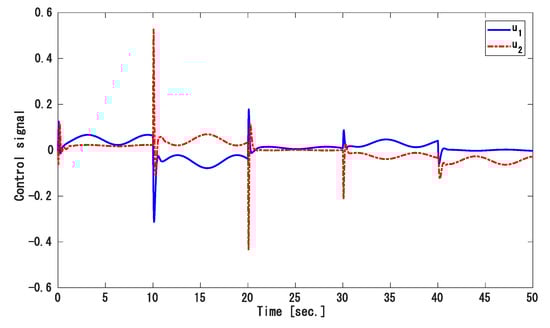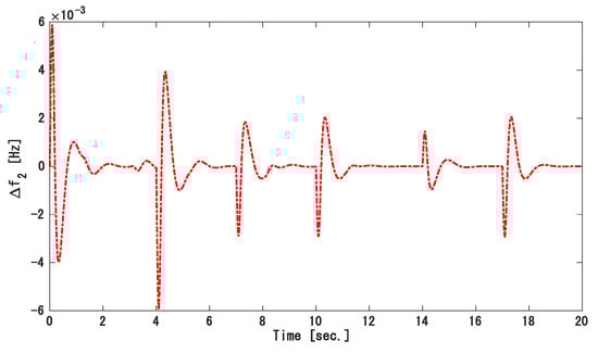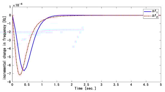 The deviation in the frequency of the first and second areas is displayed in Figure 5, and the tie-line power fluctuation is displayed in Figure 6. Figure 7 gives the input of the controller and . Once again, at normal operation, the dynamic changes are at zero marks. With the matched condition in the state matrix as shown in [31], both dynamic change values fluctuated, respectively. At 3 s the dynamic spikes were brought to a safe range. The response of the MAPS in terms of the maximum overshoots and settling time are in comparison with [31]. The values of both are written in Table 2.