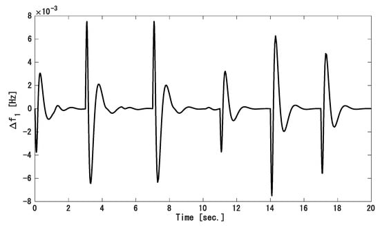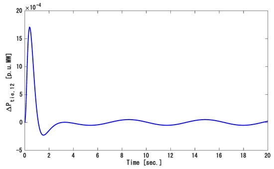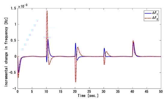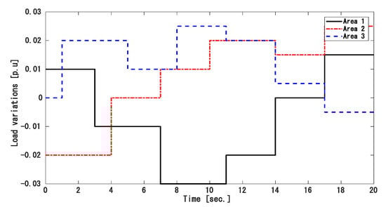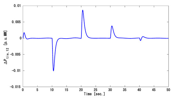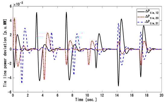 Because load demands in a real power system keep changing, we applied random load variation in each area as shown in Figure 13. Figure 14, Figure 15 and Figure 16 show the frequency variation of area 1, 2, and 3, respectively, and the tie-line power deviation is displayed in Figure 17. The tie-line power flow and frequency fluctuation rapidly converged to zero even though the system state variables were not measured. Therefore, this approach is better to maintain frequency and tie-line power at a safe range in a large power network where SSV are difficult to measure.