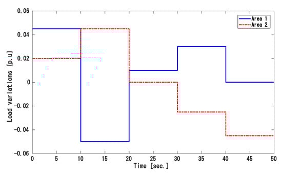 To validate the robustness of the suggested controller, a random load at 10 s intervals was applied to the power plants. We considered a random load variations pattern given in Figure 8, while the mismatched uncertainty was still kept the same as with case 2. Figure 9 shows the frequency divergence. The tie-line power variation is displayed in Figure 10 and the control signals in both areas are displayed in Figure 11.