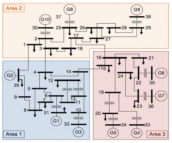 To extend the proposed controller based on state observer performance, we simulated it in a New England 39 bus system as Figure 12 and system parameters are from [33]. It comprised of three area power systems with 10 generators and 39 bus nodes. All generators were synchronized and connected in parallel.