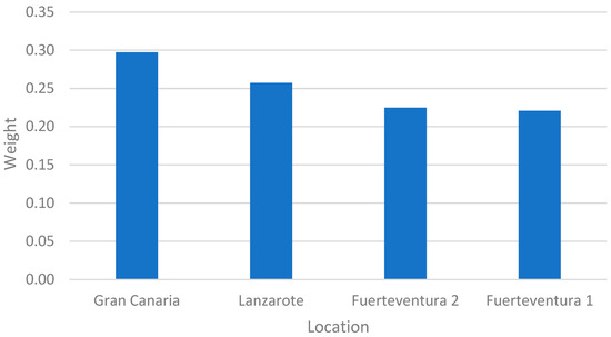 Figure 4 displays the preference ranking according to the AHP method for the floating wind farms in the Canary Islands. In general, it can be said that the results are similar. Generally, in the literature, there are some discordances with the results of the AHP and other MCDM. In this case, the accordance between results can be seen as a consistency of the methodology and criteria selected.