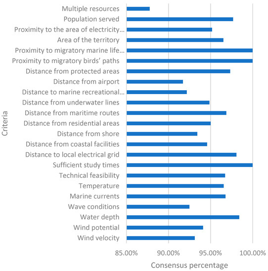 The consensus related to the criteria importance is 44% between the experts. This value is meagre but is coherent with each stakeholder’s different background and the different point of view related to site selection priorities. Nevertheless, on evaluating locations based on each criterion, the percentage of consensus between the various stakeholders reaches a value of up to 96%.