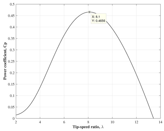 where is the pitch angle of the turbine blades and the values of constants – are related to the unique design of a wind turbine and are generally obtained empirically in laboratory tests. In this proposal, the stall wind turbine parameters , , , , , , and were taken from Voltolini et al. [19]. The power coefficient curve is depicted in Figure 1, where the maximum power coefficient is , which is related to the desired tip-speed ratio of . The desired is a constant value, which is obtained when Equation (4) is maximum .