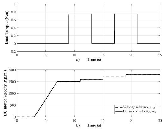 where the armature current and rotor velocity are the state variables; the mechanical input is the load torque; is the control input that corresponds to the voltage supplied to armature winding; and are the resistance and inductance of the armature winding, respectively; and are the frictional coefficient and inertial moment of the DC motor and the mechanical load together, respectively; and and are the machine constants that include the constant field current, both having the same value but different measure units. The proposal of the robust rotor velocity observer has the following form [21]: