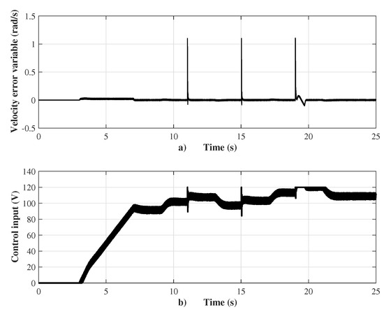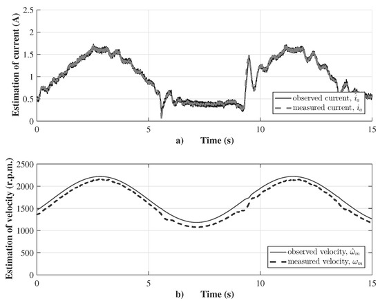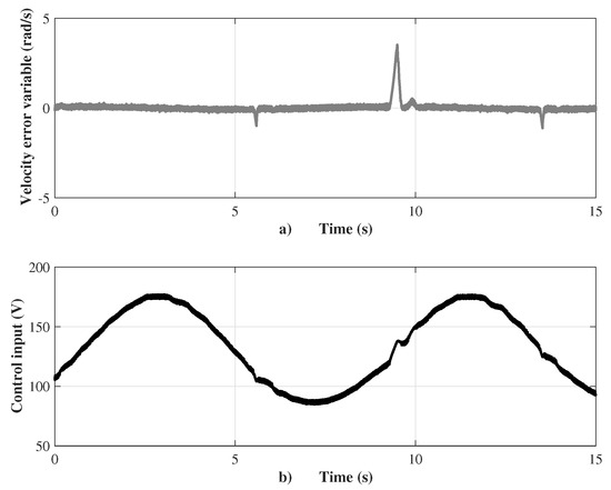Figure 9a shows that the velocity error variable stays close to zero at high frequency, while the control input, as the voltage supply to armature winding of the DC motor, varies from to 177 V with an average chattering of 2 V, as shown in Figure 9b. The sensorless velocity controller applies the super-twisting control law of sliding modes (27), which was tuned with the gains and , according to restrictions setting in (29) and (30). The velocity observer performance is shown in Figure 10, where the observed current is almost the same as the measured current , as shown in Figure 10a. This guaranties a good estimation of the velocity via the robust observer, which is compared with the measured velocity for validation purposes (see Figure 10b). The robust velocity observer applies a discontinuous input of first-order sliding modes to adjust the observation variables, which was tuned with gains to vanish the velocity estimation error to the origin, using the discontinuous input to force the current estimation error to the origin in finite time (12).