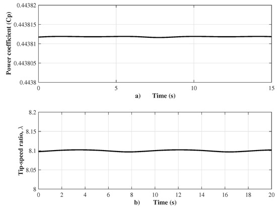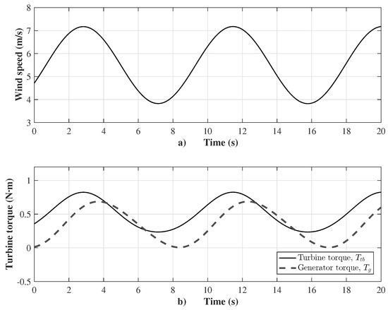 The main test corresponds to the wind turbine emulator performance, which is shown in Figure 6. It is observed that the DC motor velocity tracks closely the velocity reference set by the virtual wind system, and, thus, the control goal is achieved, i.e., the emulator behaves as a wind turbine. The tracking of the oscillating velocity reference is accurate, as observed in Figure 6. The velocity reference oscillates from 1186 to 2221 r.p.m. due to the wind speed, oscillating approximately from 3.8 to 7.2 m/s, with a time period of s, as shown in Figure 7a, being the wind speed the input of the virtual wind system. Besides, the wind velocity oscillation causes oscillation of both the wind turbine torque (from to N.m) and the generator torque (from to N.m); the time period of oscillation of these two signals is s, as shown in Figure 7b. The generator torque is made to match with the reference torque defined in Equation (9). This mode of operation is achieved when the torque of the generator is controlled, and, consequently, the captured wind energy is maximized. Therefore, the power coefficient maintains a value of near its maximum value, as shown in Figure 8a, and the corresponding desired value of tip-speed ratio is maintained at , as depicted in Figure 8b.