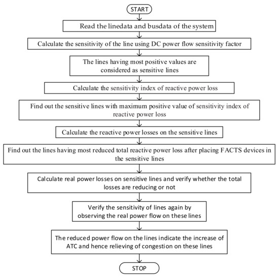 The Sensitivity and Power loss-based Congestion reduction (SPCR) method presents the method of finding the optimal location of FACTS devices by adopting the technique of first calculating the sensitivity of all the lines in the considered system and then observing the reduction of reactive and real power losses in the most sensitive lines. The lines having reduced losses are again verified by observing the reduction in real power flow. Because the reduction in power flow by placing FACTS devices in these lines will ensure the increase of ATC in these lines and, hence, there will be less congestion in the system. Figure 4 shows the flowchart of the recommended SPCR method.
