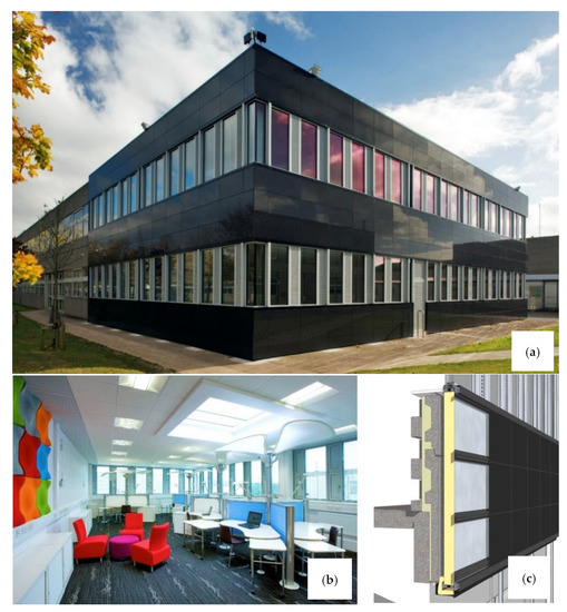 NBERT in the zero2020 building: (a) image of exterior of retrofitted building; (b) image of open plan office with MCSL ventilation system; (c) image of high-performance retrofitted wall detail.