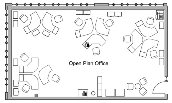 Figure 2 displays the floor plan of the NBERT open plan office, while the bottom-left (b) of Figure 1 displays its interior, which has glazed facades to the west and south, and a roof light. This room was selected as the application in this study for the following reasons: (1) highly insulated external façade, therefore, the internal air temperature is to a higher degree, thermally decoupled from the external air temperature in comparison to a typical building. Occupancy related heat gains therefore, have a stronger influence on internal air temperature. (2) the space has a highly variable occupancy schedule [23], therefore profiling occupancy related gains is more difficult than a conventional open space office. (3) NBERT employs a natural ventilation system with automatic openings (which can be manually overridden by occupants), and manually operated openings, which are controlled exclusively by the occupants. Therefore, the air temperature control in the space relies on both external climatic conditions, (through solar irradiation and ventilation convection exchanges), and internal OB and interactions with the space. For these reasons, the space was deemed an interesting application for a GB model with automatic calibration and validation using measured empirical data.