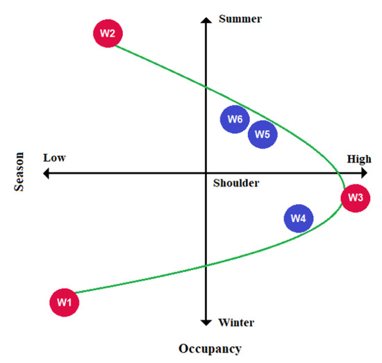 Plot of seasons and occupancy levels considered for calibration in red and validation in blue (Points are illustrative and are representative of typical patterns of occupancy in the case study building).