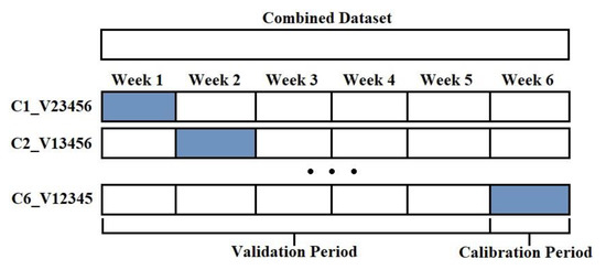 In this section, we compared the performance of the GB model for two different calibration and validation datasets. The first dataset contained one week for calibration and five weeks for validation purposes (C1V5), while the second dataset contained three weeks for calibration and three weeks for validation purposes (C3V3). Each dataset was partitioned and folded into multiple calibration and validation subsets (Figure 4) to allow multiple calibration and validation arrangements [77]. The purpose of comparing the calibration and validation of the GB model for these two datasets was to determine the performance gap when the model was calibrated using just one week in a particular season with a particular occupancy level versus being calibrated using multiple weeks over varying seasons and occupancy levels.