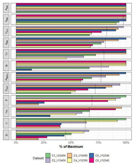 Parameter selecting based on GB models that were calibrated using one week (C1V5). Coloured bars indicate parameters selected for each calibration set, dashed line indicates mean value.