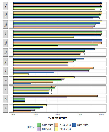 For the four simulations of C123_V456 through to C256_V134, the mean RMSE was 109%, 53%, 65%, and 29% higher in the validation period compared to the calibration period, respectively. The mean increase in RMSE from the calibration periods to the validation periods was 62%. Figure 7 illustrates the final parameter selections that the calibration algorithm made for each three-week combination of calibration and validation datasets. As can be seen, the parameter values selected by the algorithm can vary depending on the three weeks used for the calibration dataset. However, the variance was substantially lower in comparison to the C1V5 results (Figure 6). The mean of the standard deviations for the 11 parameters was 13%.