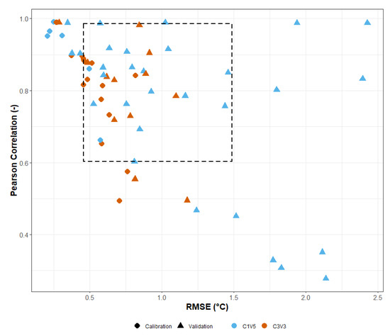 Scatterplots of Pearson correlations with respect to RMSE. Data grouped according to calibration approaches, i.e., for one week (C1V5) and three week (C3V3), using colour scheme and according to stage (blue for one week and orange for three weeks) and using data point shape for calibration or validation (circle for calibration period and triangle for validation period). Dashed box indicates the accuracy of WB model (see Section 4.2 for comparison with GB model).