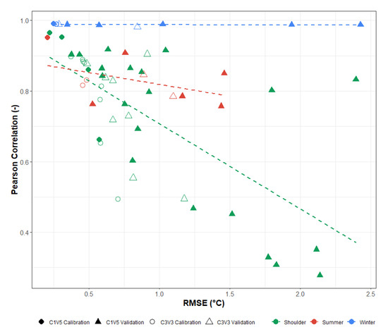 Figure 8 displays the performance of the GB model when different sources of data were used for calibration and validation. The GB model calibrated on three weeks of data (C3V3), produced results with a relatively consistent level of accuracy, with mean RMSE values of between 0.58 °C and 0.67 °C, maximum RMSE values of between 0.82 °C and 1.18 °C, Pearson correlation coefficients ranged from 0.49 to 0.99, for calibration and validation periods, respectively.
