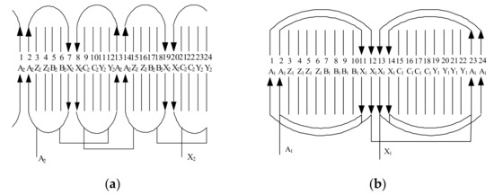 A phase winding schematic diagram of motors. (a) Torque Windings; (b) suspension force windings.