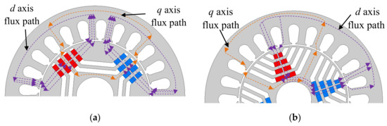 Flux path of proposed PMa-BSynRMs. (a) PMa-BSynRM I; (b) PMa-BSynRM II.