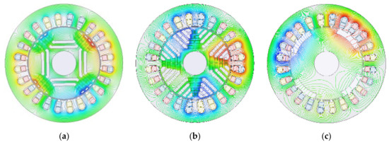 Magnetic flux density in three motors. (a) PMa-BSynRM I; (b) PMa-BSynRM II; (c) BSynRM.
