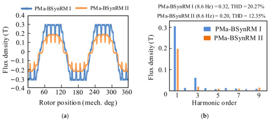 Figure 9a shows that the peak value of the no-load air gap magnetic density of the PMa-BSynRM I is higher than that of the PMa-BSynRM II. The harmonic analysis of the air gap magnetic density is shown in Figure 9b, although the THD of the PMa-SynRM I is worse than that of the PMa-BSynRM II; the fundamental amplitude of the former is larger than that of the latter.