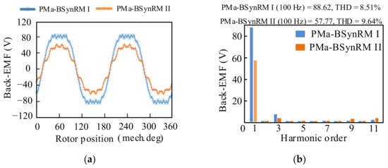In Figure 10a, the no-load back-EMF of PMa-BSynRM I has a higher peak value than PMa-BSynRM II. According to the Fourier transform results of the no-load back-EMF, the amplitude of each harmonic can be obtained. Figure 10b shows the total harmonic distortion (THD) of the PMa-BSynRM I and the PMa-BSynRM II are 8.51% and 9.64%, respectively. Consistent with the harmonic analysis results of the air gap flux density, the THD of the PMa-BSynRM I is smaller than that of the PMa-BSynRM II, and the fundamental amplitude of the PMa-BSynRM I is larger than that of the PMa-BSynRM II.