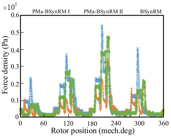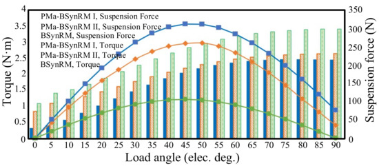 In Figure 11, it is seen that when the load angle is 45°, the maximum torque of the three motors can be obtained. The maximum torque of PMa-BSynRM I was 3.62 N·m, which was greater than the maximum torques of PMa-BSynRM II and BSynRM. Owing to the fact that the suspension force is engendered by the superposition of the magnetic field of the permanent magnet and the suspension flux, the suspension flux passes through the thick permanent magnet and the non-magnetic material; the average suspension forces of the PMa-BSynRM I and PMa-BSynRM II, which were 180 N and 194 N, were smaller than that of the BSynRM, which was 250.07 N.